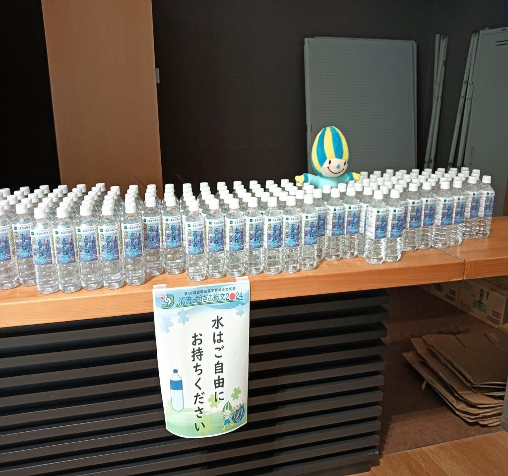 飛騨市古川町で行われた文芸部門大会では、並べられたお水の中に、かわいいミナモ(岐阜県の川の水面に住むキラッキラの妖精)がひょっこり。「高賀の森水」は、全国からの参加者に無事に配付されました。
