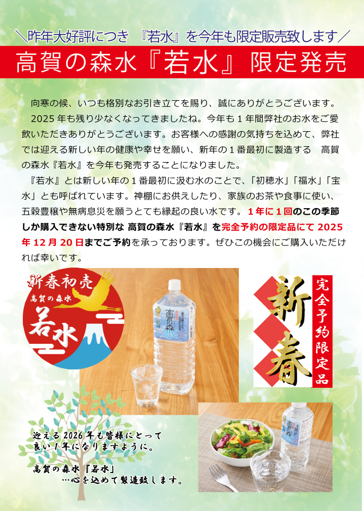 1年に1回、この時期にしか購入することのできない特別なお水 高賀の森水『若水』のご予約は、2025年12月20日までの受付となっております。