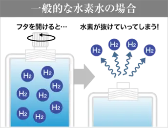 水素は非常に不安定な分子で存在しているため、常に安定的な形になりたいという性質を持っています。開栓すると安定した形を求めて、すぐに空気と結びつこうとする性質のため、従来の水素水では開栓した瞬間から水素がどんどん逃げてしまうのが弱点でした。そのため、バブリングにて発生させて水素を閉じ込める従来の製法では、アルミ缶やパウチでの商品がほとんどでした。
